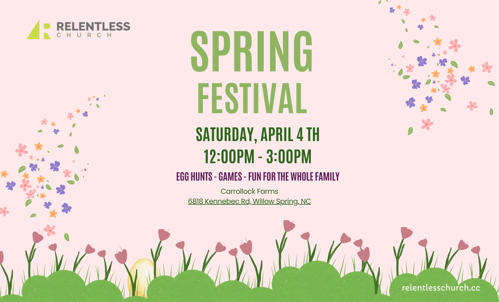 Carrollock Farms 6818 Kennebec Rd, Willow Spring, NC, United StatesSPRING FESTIVAL - SATURDAY, APRIL 4 - 12:00pm - 3:00pm All Relentless Church, family, friends and surrounding community are invited to join us for a Spring Festival at Carrollock Farms. We’ll enjoy light refreshments, games, face painting, and we'll have 3 Golden Egg Hunts for toddlers - 5th graders. Invite a friend and come enjoy […]